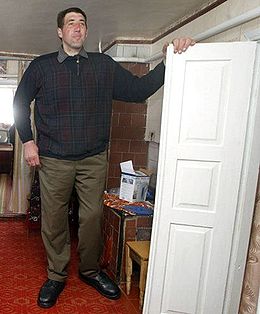 Довідково. Леонід Іванович СТАДНИК народився у 1971 році у селі Подолянці Чуднівського району Житомирської області. Закінчив Житомирський сільськогосподарський інститут, працював сільським ветеринаром. Він - найвища людина планети серед людей, що нині живуть. Його зріст – 2 метри 57 сантиметрів.
