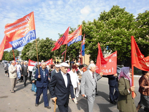 Прогрессивные социалисты Наталии Витренко взяли участие в демонстрации и митинге посвященном Международному Дню солидарности трудящихся-1 Мая. Духовой оркестр играл мелодии советского времени. Люди шли в колонне с букетами цветов и флагами ПСПУ. На Площади Ленина прошел митинг, на котором выступила секретарь горкома ПСПУ Шакаленко Л.В. Она рассказала о нашей партии и ее лидере Витренко Н.М., а также о тяжелой жизни людей в Украине. Площадь окружили молодчики в спец. форме . Некоторые из них стояли в боксерских перчатках. Вели они себя вольготно и нагло. Но все обошлось без потасовки. Разошлись мирно.