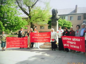 Прогрессисты пришли на место сбора с цветами, плакатами, на груди значки ПСПУ и красные ленты. Флаги и некоторые плакаты, в которых были слова "Ленин", "остановите войну" и другие, нам не разрешили раскрыть. Мы прошли по центральной улице города и остановились перед бюстом Т.Г.Шевченка. Милиция, которая окружила людей, предупредила, чтобы никто не высказывался против власти, против войны, чтобы не было резких слов, которыми можно спровоцировать на неприятность. Чтобы все было мирно, спокойно, толерантно. Дожили! Что на своей земле, в "демократическом" государстве, людям запрещают высказывать свое мнение, ходить на свои праздники, поднимать флаги и транспаранты против войны. Они убивают нашу гордость о том социализме, при котором мы бесплатно лечились и учились, честно трудились на предприятиях, в колхозах и совхозах и были уверенны в завтрашнем дне. Фашисты! Убийцы! Люди долго молчать не будут! Дрожите трусы, воры, предатели! Собирайте чемоданы с награбленным народным добром и убирайтесь вон, самолеты ваши уже на взлете! А еще нас зорко "оберегали" молодые люди с сине-желтыми повязками на рукаве и с такими же ленточками с красным маком на груди.
