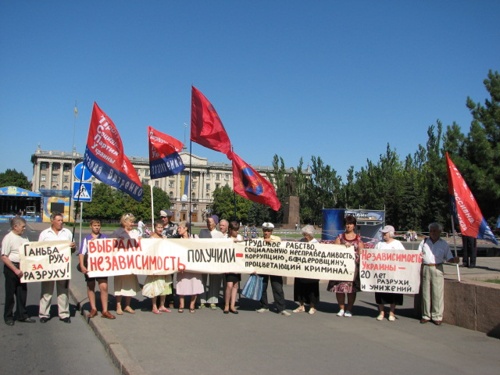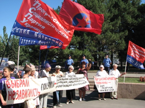 Сегодня, 24 августа, прогрессивная Николаевщина выразила свое негативное отношение и готовность борьбы с криминальной олигархической властью. В то время, когда молодые депутаты обл.совета, а-ля Ландик, в вышиванках с кривыми ухмылочками пытались, что-то "блеять" на митинге в честь так называемой "независимости", Николаевская областная организация ПСПУ развернула пикет под лозунгом: "20 лет разрухи и унижений". Милиция пыталась не допустить активистов ПСПУ на площадь Ленина, мешала развернуть плакаты, но под напором секретаря Николаевского обкома ПСПУ Павловой А.В., милиция отступила. К витренковцам стали подходить люди, насильно согнаные на митинг в честь "независимости" Украины своими хозяевами из ПР и высказывать свою поддержку действиям членов ПСПУ, плюя в сторону трибуны, с которой слышалось региональное блеяние в честь победы капитализма 20 лет назад. Секретарь Николаевского горкома ПСПУ Никонов Д.В. зачитал заявление Председателя Прогрессивной социалистической партии Украины Витренко Н.М. "20 лет "независимости" Украины – 20 лет лжи, предательства и грабежа". Два часа стоял пикет ПСПУ, и все николаевцы выражали свою поддержку в борьбе с продажным олигархическим режимом Партии регионов.