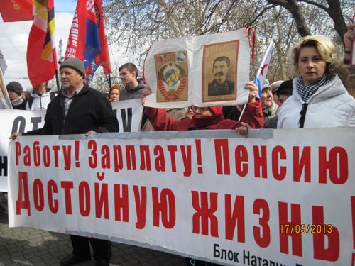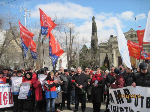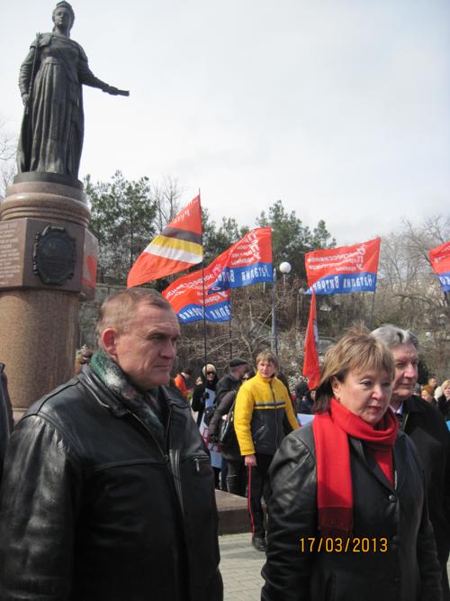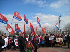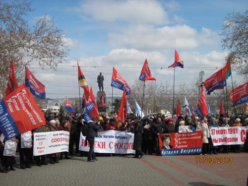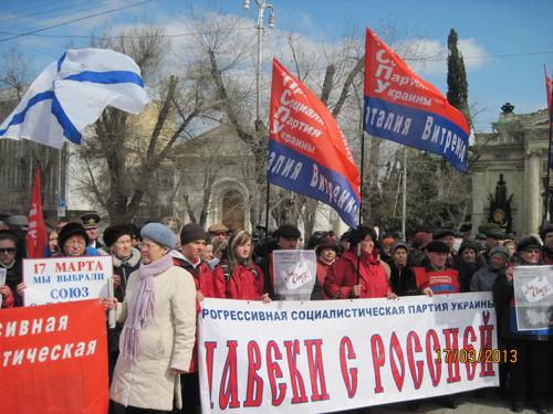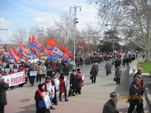 Красочная колонна, во главе которой шли политики-борцы , прошла улицей Ленина до Мемориала героической обороны Севастополя. Гордо развевались флаги Детей войны Севастополя, Блока Наталии Витренко, Союзного движения "17 марта", партии Киевская Русь. Со своими штандартами прошли представители пророссийских и молодежных организаций. Призывы на транспарантах ярко заявили о стремлении нашего народа: "Спасение Украины в Таможенном союзе!", "17 марта 1991 года мы выбрали Союз!", "Кабмин – в отставку! Олигархов на свалку!", "Навеки с Россией!", "Работу! Зарплату! Пенсию! Достойную жизнь!"