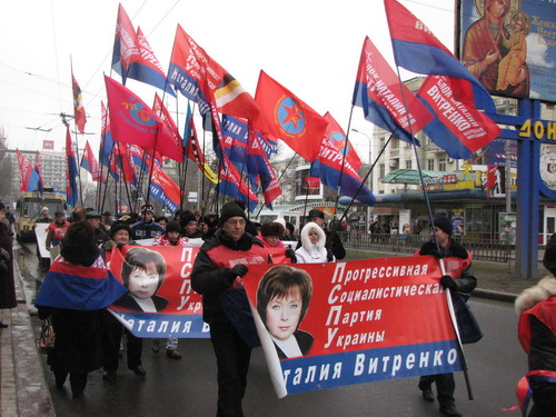 Прогрессивная социалистическая партия Украины свою колонну украсила театрализованной композицией символизирующей Украину, которую в разные стороны тянет оранжевый президент и белосердечный премьер-министр. Украину спасет единство с братьями-славянами - Россией и Белоруссией. Именно с таким лозунгом "Украина, Россия, Беларусь - нам нужен Советский Союз" выступила секретарь Донецкого Обкома ПСПУ Л.Каёткина. В своем выступлении она сказала о том, что с кризисом можно бороться, только объединившись. И сегодня уже есть начало. Объединились три левые партии - Прогрессивная социалистическая партия Украины, Партия "Киевская Русь", Партия "Возрождение украинского села". Три партии создали Правительство народного спасения во главе с премьер-министром Наталией Витренко, которое предложило путь выхода из кризиса. И сегодня нужно четко знать, что в сегодняшнем кризисе виноваты все: президент, правительство, Верховная Рада. Поэтому мы говорим: "Пусть убираются все!". Прогрессисты предлагают отправить немедленно в отставку и под суд не только президента, но и премьер-министра, Стельмаха, Порошенко за предательство национальных интересов Украины. Украине нужно немедленно выйти из ВТО и войти в Единое Экономическое пространство с Россией, Белоруссией и Казахстаном. В качестве первоочередных мер: прекратить незаконное увольнение рабочих, наложить мораторий на повышение цен на продукты, на тарифы за коммунальные услуги, перейти на модель дорогой рабочей силы, обеспечить бесплатное питание в школах.