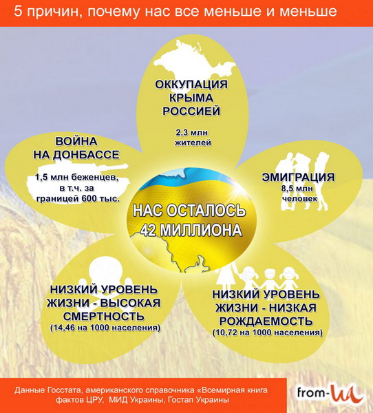 Недавно украинский МИД заявил, что только в России пребывают около 4 миллионов наших сограждан! За миллион переваливает прогнозируемая цифра выехавших в Европу и Америку, причем их было бы в разы больше, если бы не визовый режим и языковые барьеры. И сколько из них там в конечном итоге так и останется? А ведь все они сейчас входят в официальную статистику населения Украины. Таким образом, реальное население страны наверняка уже опустилось ниже 40 миллионов.
