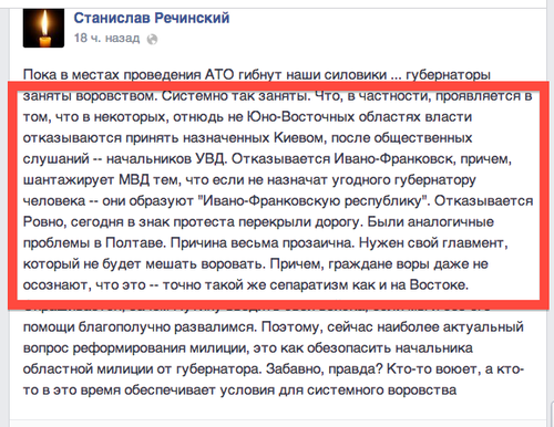 Не далее, чем вчера советник министра внутренних дел Станислав Речинский на своей стене в фейсбук написал следующее: