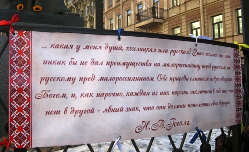 На баннере слова Гоголя: "Какая у меня душа, хохлацкая или русская? Знаю только то, что никак бы не дал преимущества ни малороссиянину перед русским, ни русскому пред малороссиянином. Обе природы слишком щедро одарены Богом, и как нарочно каждая из них порознь заключает в себе то, чего нет в другой, - явный знак, что они должны пополнить одна другую".