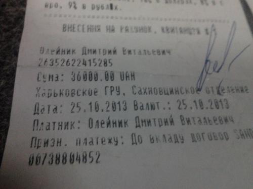 После столкновений в Харьковской ОГА активисты Объединения "Боротьба" нашли в здании кредитные карточки, чеки, депозиты и документы одного из представителей "Правого сектора". Все они зарегистрированы на имя студента ИНФИСа Дениса Витальевича Олейника, 1994 года рождения, который оперировал совсем "не детскими" суммами в валюте и гривнях. Об этом свидетельствуют два депозита на 10873 доллара и 28000 грн., чек на 36000 грн и квитанция на покупку 4700 долларов, "забытые" этим "активистом"-спортсменом на месте событий.