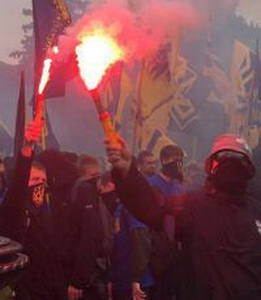 К сожалению, «Силы нации» было не много. Тысячи две. Даже меньше. Зато могу с уверенностью сказать: уровень организации шоу значительно вырос. Брутальные черные внедорожники «Тойота-Тундра», оборудованные звукоусилителями, заняли центральное место перед ВР. Собрались милые, отзывчивые люди в масках и балаклавах. Глядя в их честные, абсолютно одухотворенные глаза, невольно хочется завести разговор о творчестве Ван Гога. Ну, там о, с...ка, магии светотеней на подсолнухах и отрезанных ушах. Об ушах, кстати, особо тянет подискутировать. Несмотря на кордон правоохранителей, который шмонал всех перед входом на парламентский пятачок, молодая поросль нации открыто стояла с файерами. Ну да, все верно: батальон «Азов» входит в структуру МВД, а человек-Шкиряк, нарезающий круги вокруг Рады в надежде дать кому-нибудь интервью, только подтверждает данную теорию.