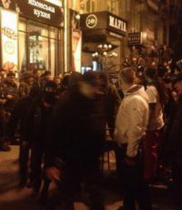 "Тяжело вооруженные" члены легальной партии "Правый сектор", сгибаясь под тяжестью разнообразного стрелкового вооружения, прибыли к ресторану и вызволили побратима, который уже заскучал в туалете. Они образовали живой коридор. Ну, так принято делать, когда речь идет о тривиальной бытовухе со стрельбой в центре столицы. Просто некоторые герои революции не совсем понимают других героев революции, и на этой почве возникают перестрелки. Да это обычное дело. Все равно в центре тусуются только майдановцы, "самообороновцы", "правосеки" и другие вооруженные лица. Киевляне стараются обходить эту зону стороной, поскольку майдановцы еще не успели собрать урожай, ходят голодными, питаются пиццей, деньги на которую дают добрые владельцы торговых точек после демонстрации некоторых предметов традиционной экипировки представителей "евромайдана".