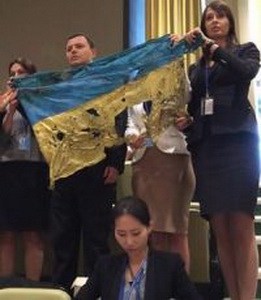 И вот события развиваются динамично и быстро: Ганна вытаскивает из специального места священный символ Иловайского котла, порванный снарядами бурятского спецназа. Как только Путин начинает свою изначально провальную речь, она слегка подпрыгивает на своих мощных, накачанных в сессионном зале ногах. Весь мир с содроганием следит за тем, как эта мужественная женщина вступает в открытое противостояние с Мордором. Однако двойные стандарты лживой западной демократии сработали даже здесь, в самой сердцевине ООН. Появились какие-то афроамериканцы, представившиеся секьюрити, грубо, бесцеремонно и без всякого почтения к как бы женским формам Ганны и ее товарищей вывели протестующих в направлении туалета ООН. При этом один из афроамериканцев просто скомкал флаг со следами ДНК Гопко и Парасюка и вынес его вслед за пассионарными украинскими героями, как какую-то половую тряпку.