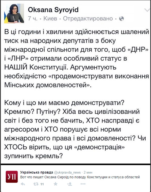 Мысли полились из головы Оксаны, как нечто другое минутой ранее. Клава стонала от натиска пальцев патриотки. "В эти минуты, дорогие патриоты и патриотки, осуществляется шалэный тыск на мою голову"... Что-то в этой фразе ей не понравилось. Осмотрев доступную часть черепа в зеркале, вице-спикер пришла к выводу, что нельзя акцентировать внимание лишь на единичном случае: "...шалэный тыск на народных депутатов со стороны международного сообщества, чтобы "ДНР" и "ЛНР" получили особый статус в нашей Конституции". Пытливый ум галичанской женщины, рано познавшей все трудности и тяготы работы в офисе, подсказал Оксане – "надо побольше капса". Вице-спикер согласилась с доводами пытливого ума, с которым пыталась дружить. Правда, неумело и не всегда, но то такое... Поэтому слово "нашей" было набрано как "НАШЕЙ". Не правда ли, совершенно гениальный прием, который на форумах принято называть "сра...ть капсом"? Сразу совсем другое впечатление от текста. Чтобы поймать постоянно ускользающую мысль, Сыроид представила кровавый образ Путина. Этот нехитрый мнемонический прием всегда помогал ей в трудных жизненных ситуациях, при принятии сложных решений и расстройствах желудка. Сразу пришла муза, вдохновение и рыжая озорная белочка. Текст полился из мозга вице-спикера журчащей струей: "Мир так хочет навязать нам сейчас "особый статус" для контролируемых боевиками территорий лишь для того, чтобы это перестало быть "войной", за которую должны нести ответственность также и те страны, которые гарантировали Украине территориальную целостность по Будапештскому меморандуму". В этом месте Оксане стало себя реально жалко. Она выступила в одиночку против целого цивилизованного мира, который ополчился против нее. "Мир хочет, чтобы это стало "внутренним конфликтом", потому что он устал и хочет избавиться от этой крайне неудобной темы", – передала Оксана свое внутреннее видение мирового устройства. Надо сказать, проникновение в ментальность мировой закулисы всегда давалось Сыроид легко и непринужденно. Детская травма, полученная в ходе столкновения с крупным рогатым скотом, позволяла Оксане недрогнувшей рукой срывать покровы с заговоров, будучи в относительно зрелом возрасте. Внезапно перед Сыроид возник Владимир Владимирович на медведе, голый по пояс и с винтовкой. Путин показывал ей фак и дьявольски хохотал. "Фейсбучное" творчество получило очередной мощный толчок. Основательно очистив разум и кишечник, видный деятель "САДОпомочи" застрочила с удвоенной энергией: "И Кремль мечтает, чтобы для всего мира это стало "украинским кризисом", потому что с начала навязывает миру историю о том, что нет российских войск на востоке, нет наемников... А еще Кремль хочет, чтобы именно эти "отсутствующие" русские войска и наемники через свой "особый статус" получили пропуск к политическому процессу Украины, возможность влиять на внешнюю политику и финансирование из государственного бюджета за счет украинского народа". Закончив этот поистине титанический труд, вице-спикер обессилено откинулась на то, на что обычно откидываются в подобных случаях. Осталось добавить последний, эмоциональный мазок. В поисках мазка Сыроид стоя спела гимн. Не помогло. Прыжки на месте дали некоторый эффект, но прихода не было. Внезапно она представила себя идущей в атаку на кремлевские танки. Наступи