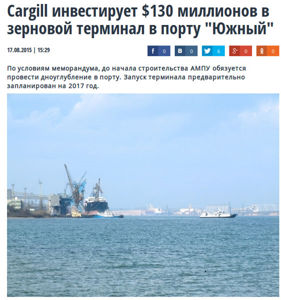 Министерство инфраструктуры Украины подписало с американской сельскохозяйственной компанией Cargill меморандум о намерении инвестировать 130 миллионов долларов в реализацию проекта зернового терминала в одном из крупнейших портов Украины морском торговом порту "Южный" (Одесская область).