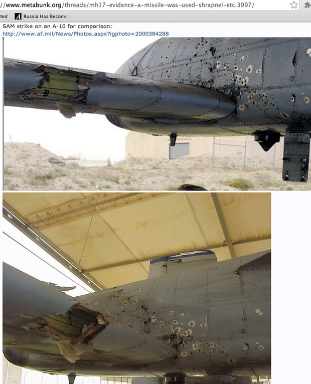 Некоторые читатели, которые откликнулись на мой пост о статье Хайсенко, говорят, что шрапнель от ракеты Бук могла вызвать эти дыры в стороне кабины. Однако, это возражение игнорирует еще одно ключевое соображение анализа Хайсенко: "Вы можете видеть входящие и выходящие отверстия. Края входных отверстий изогнуты внутрь, это небольшие отверстия, круглые и чистые, наиболее вероятно вызванные снарядами калибром 30 миллиметров. Края других - более крупных и слегка потертых - выходных отверстий, состоят из обрывок металла от снарядов того же калибра. Кроме того, очевидно, что... эти - выходные отверстия наружного слоя двойной алюминиевой армированной структуры изогнуты наружу".