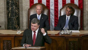 Порошенко также призвал США продолжать усиливать санкции "против агрессора". Он подчеркнул, что "украинская война... это война за свободу демократии, европейских ценностей". По версии Порошенко, украинская нация сделала выбор в пользу свободы и демократии, а "другая нация решила наказать Украину за такие шаги". И мир такого поведения не может допустить.