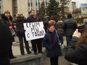 1-го марта 2014 г. днепропетровцы, как и все жители юго-востока, приняли участие в одномоментном проведении во всех городах заявленных областей антифашистского митинга. Активисты ПСПУ и Партии "Киевская Русь" в Днепропетровской области тоже заявили о своей солидарности с чистыми, светлыми, спасительными силами, которые помогут выйти Украине из кризиса! Люди, которых раньше я не видела на митингах, вдруг пришли во всеоружии. Я имею в виду высокую подготовку к митингу. Стояли с плакатами, на которых было написано: КРЫМ, МЫ С ТОБОЙ! ФАШИЗМ НЕ ПРОЙДЕТ! БУДУЩЕЕ УКРАИНЫ – В ТС! БЕРКУТ – НАШИ ГЕРОИ! КУДА ДЕЛАСЬ КОНСТИТУЦИЯ УКРАИНЫ?