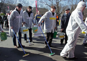Однако на марш смогла пройти группа антифашистов в белых костюмах с надписью "Дезинфекция". Около 15 человек провели показательную "чистку" площади перед памятником Свободы от неофашистов и легионеров СС.
