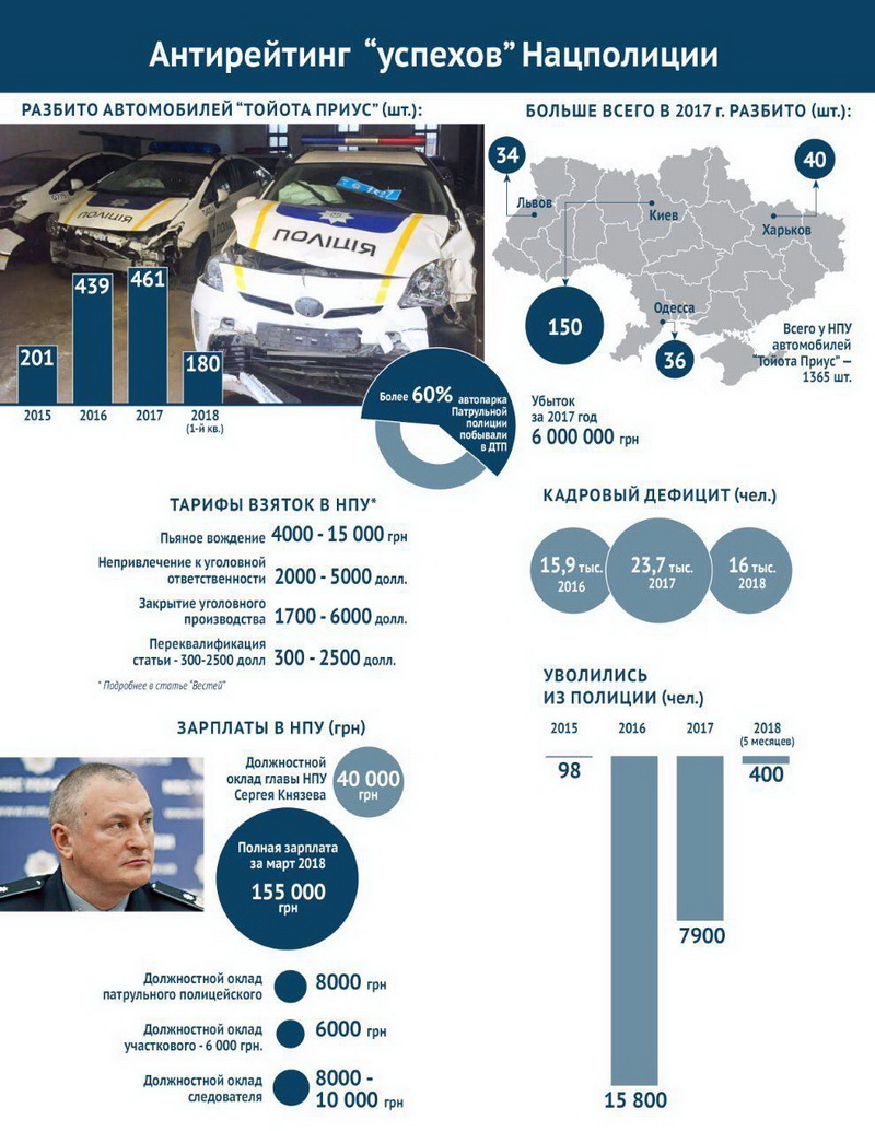 Сегодня, 4 июля, Украина отмечает третью годовщину создания Национальной полиции Украины. Чиновники торжественно рапортуют об успехах, однако известно, что новые полицейские не хуже старых продолжают брать взятки и устраивать внутри системы коррупционные схемы. Патрульные за 3 года работы перебили практически все новенькие приусы, а высокая нагрузка и низкая оплата труда в НПУ побуждают даже самых идейных и честных писать рапорты и увольняться. Об этом свидетельстуют данные о кадровом дефиците в Нацполиции.