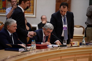 Как сообщили ИА REGNUM в пресс-службе президента Армении, Серж Саргсян еще раз поблагодарил глав государств за политическую поддержку этого процесса и заверил, что Армения очень ответственно будет относиться к своему членству в Евразийском экономическом союзе. Президент выразил надежду, что главы стран-членов ЕАЭС помогут до конца года ратифицировать этот договор в своих национальных парламентах, чтобы с 1 января следующего года Армения также начала свою работу.