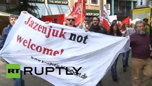 Как сообщила радиостанция Deutschlandfunk, рядом со зданием ратуши, в котором проходило мероприятие, собрались протестующие, которые держали в руках плакаты, призывающие не допустить новой войны в Европе и "остановить американский террор на Украине". На одном из транспарантов было написано: "Мистер Яценюк - партнер фашистов". Во время акции ее участники скандировали: "Террорист Яценюк". Видеозапись с митинга появилась на портале YouTube.