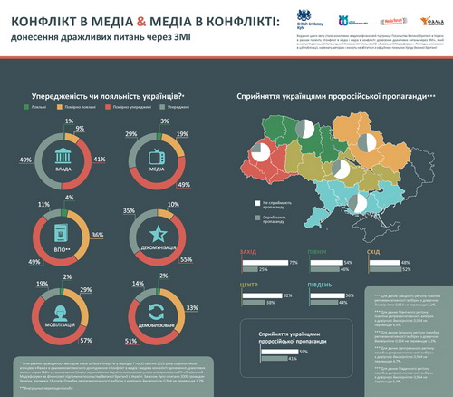 Кожен другий українець є упередженим до влади (49%), кожен третій (35%) до реформи декомунізації та засобів масової інформації (29%). Такі результати всеукраїнського дослідження «Конфлікт в медіа, медіа в конфлікті», яке провела соціологічна агенція «ФАМА» на замовлення ГО «Львівський медіафорум» та «Школи журналістики УКУ» за сприяння Посольства Великої Британії в Україні.