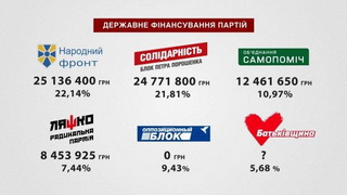 Соответственно, партия "Народный фронт" получит 25 136 400 гривен, "Партия "Блок Петра Порошенко -"Солидарность" - 24 771 800 гривен, "Объединение "Самопомич" - 12 461 650 гривен, "Радикальная Партия Олега Ляшко" - 8 453 925 гривен.