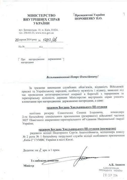 А если у Авакова плохо с памятью - публикую представление, которое Аваков внес президенту Порошенко о награждении Гришина орденом. 11 августа 2014 года по приказу Авакова мошеннику было выдано заведомо поддельное удостоверение офицера, 12 августа 2014 года Гришин получил паспорт на фамилию Семенченко, а уже 20 августа 2014 года Аваков хлопочет о награждении своего любимца».