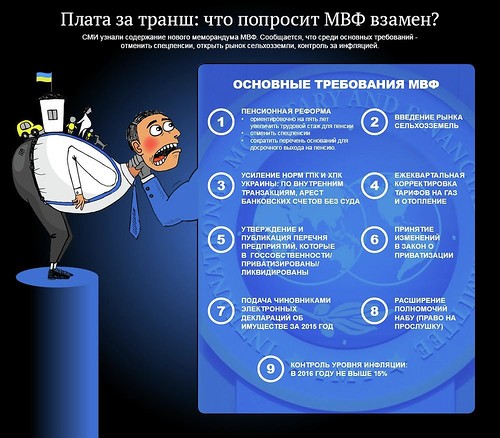 Единственная кажущаяся радость для миллионов жителей нынешней Украины – некоторое повышение пенсий и зарплат может обернуться очередным витком инфляции и повышением тарифов. Этого требует МВФ. Чтобы получить в конце 2016 г. следующий транш в размере $1,3 млрд., этот финансовый спрут выдвинул ряд безоговорочных условий, которые правительство и Рада уже начали выполнять.