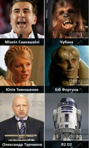 Интернет-пользователи решили, что Арсений Яценюк - это вылитый робот СЗРО, Юлия Тимошенко - Биб Фортуна, Игорь Коломойский похож на Джаббу Хатта, а Михаил Саакашвили - на Чубакку.