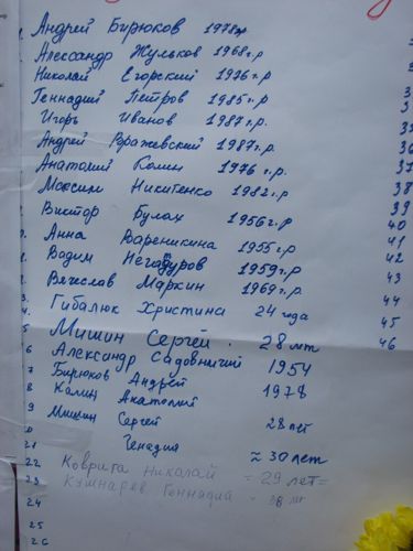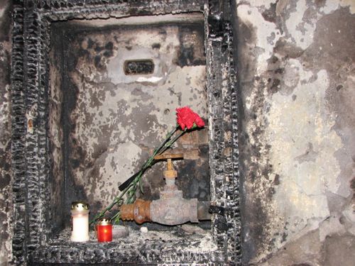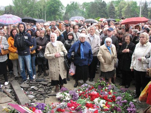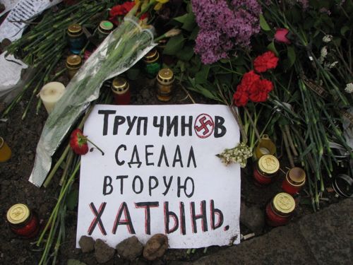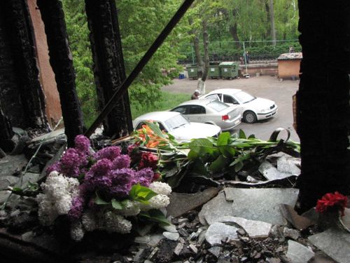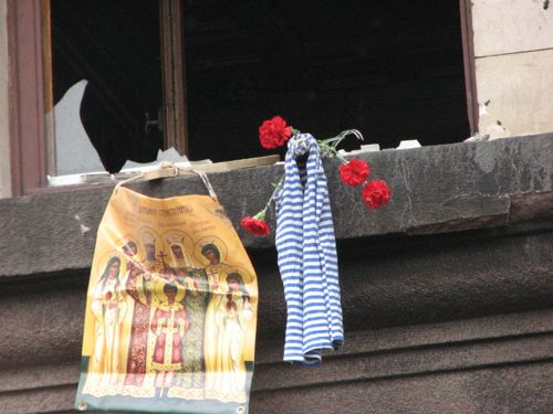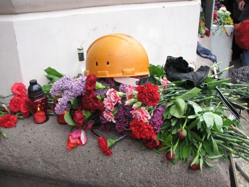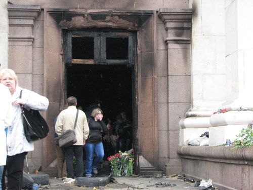 Люди несут к стенам здания свечи, иконы, цветы. Утром, милиция пыталась блокировать подходы к Дому профсоюзов, однако женщины избили милиционеров букетами цветов под крики "Позор!".