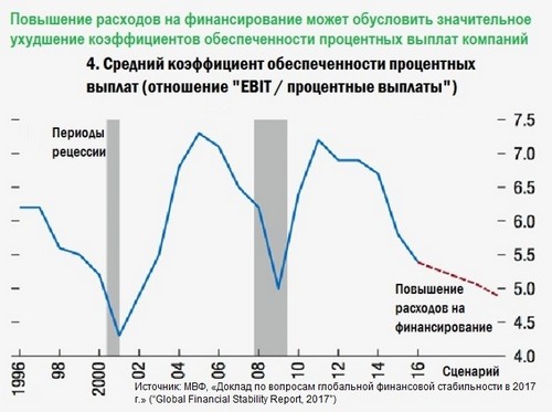 МВФ в указанном выше «Докладе по вопросам глобальной финансовой стабильности в 2017 г.» сделал шокирующий прогноз: если процентные ставки в США опять взлетят (как в ноябре-январе), то дефолт могут допустить 20% всех американских корпораций. Это выше самого высокого показателя дефолтов по ипотечным кредитам, достигнутого во время краха десять лет назад, даже для субстандартных ипотечных кредитов, долг по которым не превышал 1,5 трлн. долл.