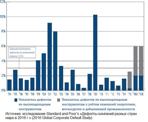 В новом докладе Standard & Poor's о дефолтах по корпоративному долгу (рассматриваются только компании, имеющие кредитные рейтинги) установлено: «Несмотря на повышение цен на нефть в течение почти всего года, в секторе добычи энергоносителей и других природных ресурсов увеличилось число дефолтов по сравнению с уже повышенным уровнем 2015 г., и на этот сектор пришлось более 50% всех дефолтов в 2016 г. Это обусловило повышение числа корпоративных дефолтов до 162», что вдвое выше среднегодового показателя за период после краха. «Объём долга этих 162 допустивших дефолт эмитентов составлял 239,8 млрд долл., что больше чем в два раза превышает показатель 2015 г. (110,3 млрд долл.)».