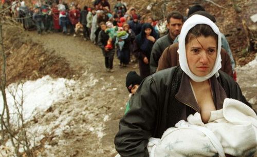 Этническая албанка кормит ребенка, одна из 2000 беженок в результате войны в Косово