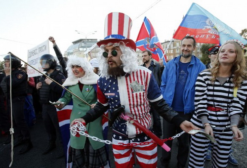 Сторонник ДНР и ЛНР в образе дядюшки Сэма во время антивоенной демонстрации в Москве, 21 сентября, 2014