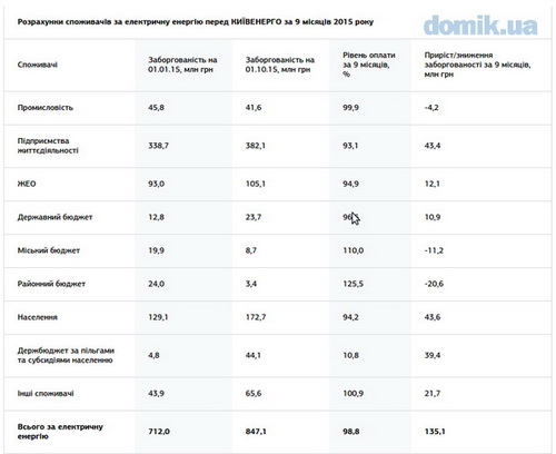 Кияни за 9 місяців заборгували 172,7 млн грн, за 2015 рік борги зросли на суму в 43,6 млн грн. Не в повному обсязі виконує свої зобов'язання і уряд, так, станом на 1 жовтня з держбюджету не було перераховано кошти на погашення субсидій та компенсацій, які були нараховані споживачам. Заборгованість становила більше 44 мнл грн, проте 8 жовтня надійшов платіж на суму 33,4 млн грн і заборгованість була частково була погашена.