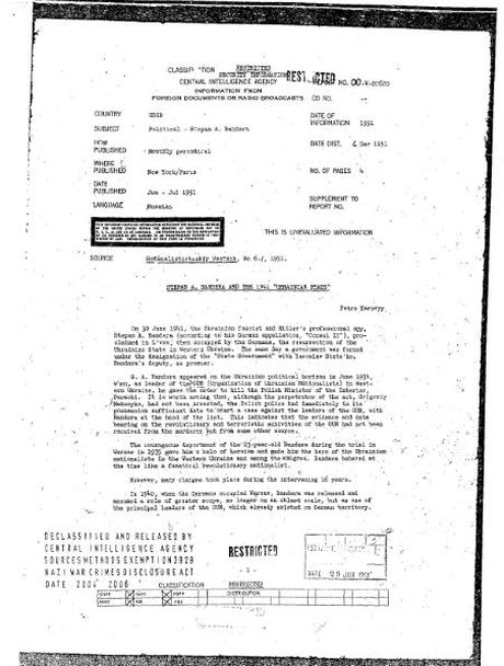 В электронной библиотеке Центрального разведывательного управления США был обнаружен прелюбопытнейший на четырех страницах, датированный 1951 годом. В документе утверждается что икона украинского национализма (интегрального национализма, русофобии, антисоветчины и антикоммунизма) Степан Бандера ( Stepan Bandera ) был германским шпионом.
