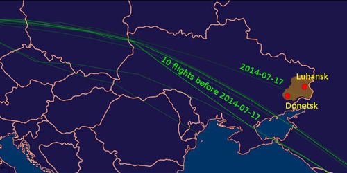 Согласно первым отчетам FlightAware.com, отслеживающего все гражданские самолеты в режиме реального времени, в четверг 17 июля рейс МН17 "Малайзийских авиалиний", выполнявшийся экипажем "Боинга-777" и следовавший из амстердамского аэропорта Схипхол в Куала-Лумпур (Малайзия), значительно отклонился по высоте и траектории полета от маршрута всех прочих коммерческих рейсов, которые после начала гражданской войны на востоке Украины в апреле этого года облетали район конфликта в южном направлении.