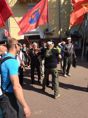Но праздник этот Великий, общенародный. Поэтому Черниговская организация ПСПУ решила его достойно отметить. Вместе с городской организацией КПУ и «Дара жизни» мы собрались в 9.30 у сквера им. Попудренко. В этом же парке возложили цветы погибшим солдатам, развернули Флаг Победы, флаги ПСПУ и женской организации «Дар жизни», выстроили колонну и пошли по центру города. Уже при построении мы видели как полицаи о чём-то шушукались с нацистами. А когда мы перешли Красную площадь и коллона пошла в сторону вала, к Екатерининской церкви, эти нацистские ублюдки с красно-чёрными повязками на мордах на нас напали. Руководил ими Корж. Нацисты выравали из рук флаги, пытались их разорвать. Орали «Слава нации!», «Слава Бандере!», «Комуняку на гілляку!», срывали ордена с георгиевскими планками, бросали в нас петарды и стреляли холостыми. Полиция ничего не могла (да и не хотела) делать.
