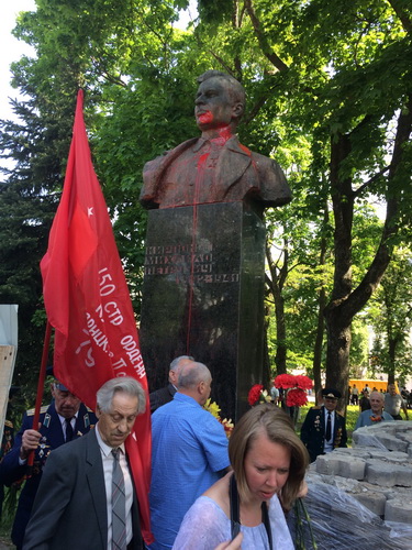 Мы большинство флагов отбили и пошли дальше. Пришли на Аллею Героев и с возмущением увидели, что памятники Героя Советского Союза Михаила Кирпоноса, легендарного командующего фронтом, и Василия Сенько, единственного в СССР штурмана дальней авиации, дважды удостоенного звания Героя Советского Союза, нацистские нелюди облили красной краской.