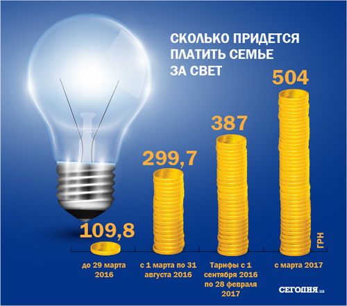 Еще в прошлом году НКРЭКУ приняла постановление N220, согласно которому электроэнергия в Украине должна подорожать почти в пять раз. До апреля прошлого года семья, которая потребляет от 100 до 600 кВт/час электроэнергии в месяц, платила за каждый киловатт 36,6 копеек. В сентябре прошлого года тариф подняли до 78,9, а сегодня – до 99 копеек.