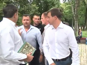 Филатова на улице оттеснила охрана Саакашвили, сам грузинский политик назвал оппонента "накачанным ублюдком". В ответ украинский депутат назвал Саакашвили "чужестранной мразью".