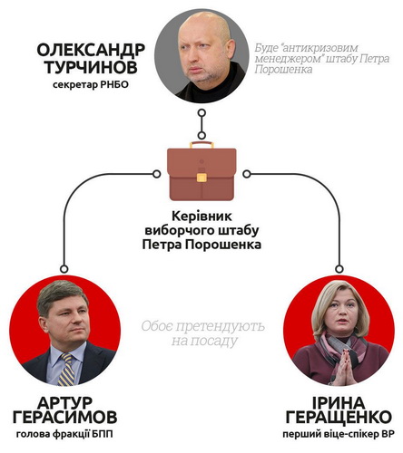 На посаду офіційного керівника штабу тепер розглядають голову фракції БПП Артура Герасимова або віце-спікера Верховної ради Ірину Геращенко. ТСН.ua звернувся з цього приводу за коментарем до Герасимова та Геращенко, однак відповідей так і не отримав.