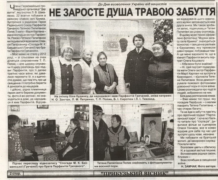 К 73-й годовщине освобождения Украины от немецко-фашистских захватчиков Первомайская ячейка Всеукраинской общественной женской организации «Дар жизни» провела памятное мероприятие. Женщины-члены этой организации во главе с ее руководительницей Ларисой Шакаленко посетили родственницу Героя Советского Союза Парфентия Гречаного в селе Крымки Первомайского района на Николаевщине.