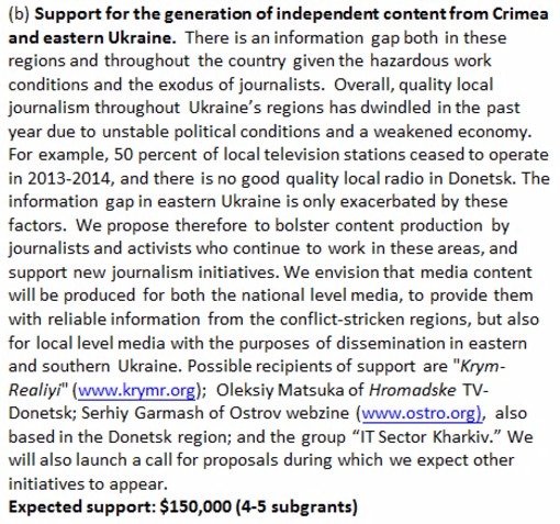 Среди документов есть списки выдачи грантов журналистам и медиа-центрам. В часности, предлагается оплачивать работу около ста журналистов, которые бы освещали события в Крыму и на востоке Украины. В одном из документов отмечается, что финанисирование составит порядка 500 тысяч долларов в год при помощи грантов и технической помощи. Среди реципиентов перечисляются, в частности, информационные порталы Крым.Реалии, Громадське ТВ, Остров.