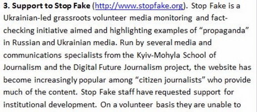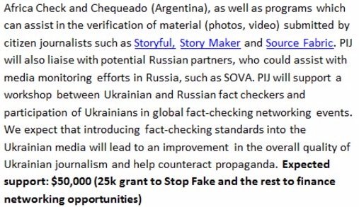 Также предлагается поддержка сайта StopFake, который ведется волонтерами, выходцами из Киево-Могилянской академии, проверяющими факты ярких примеров пропаганды в российских и украинских СМИ. В фонде Сороса отмечают, что со StopFake будут сотрудничать зарубежные порталы аналогичного формата, в частности - российский центр СОВА, и потребует финансирования порядка 50 тысяч долларов на развитие как самого сайта, так и сетей.
