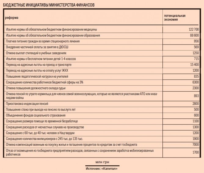 Экономить намерены на всем, в том числе на медицине и образовании, следует из списка реформ Минфина. Так, предлагается упразднить законодательные нормы, согласно которым государство должно направлять на эти две отрасли не менее 10 % национального дохода. В качестве оправдания в Минфине говорят, что это положение и так не выполняется. В связи с чем министерство предлагает внести изменения и в Конституцию, изъяв положение о бесплатных образовании и медицине. По подсчетам Минфина, только за счет этого пропадет необходимость изыскивать ежегодно порядка 211 млрд грн.