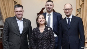 В этом смысле вектор их не интересует, а только результат. Они также единодушны в том, что никто из них никогда не был и не будет на пророссийском маршруте. В дополнение в "Батькивщине" Юлии Тимошенко и "УДАРУ" Виталия Кличко - двум крайне правым партиям, имеющим тесные связи с германской ХДС, - оппозиция также включала в себя фашистскую партию "Свобода" Олега Тягнибока. Нужно отметить, что лидер "УДАРА" Виталий Кличко, судя по его действиям, сосредоточен на победе на президентских выборах и в нынешнее распределение портфелей принципиально не вмешивается.