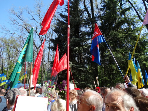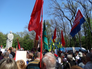 В День Победы традиционно харьковские прогрессисты приняли участие в возложении цветов на мемориальном комплексе в Лесопарке. С утра в этот день собираются сотни харьковчан у мемориального комплекса. В прежние годы это место расцвечивалось множеством флагов различных партий и общественных организаций. Однако сегодня в Харькове правят бал нацисты, поэтому власти участникам акции рекомендовали не приходить с партийными флагами и не одевать георгиевские ленточки. На подходах к мемориальному комплексу стояли группы нацистов, которые срывали с участников ленточки, пытались отобрать флаги. Тем не менее, членам ПСПУ удалось пронести пару партийных флагов и мы сгруппировались вместе с представителями «Трудовой Харьковщины», ветеранских организаций, Союза офицеров, компартии. Над колонной развевалось также несколько красных флагов и она спокойно двигалась в направлении памятника, символизирующего Родину Мать. В процессе движения участники пели песни военных лет, раздавались лозунги: «Фашизм не пройдет!» и другие. У самого памятника слева и справа от него группа нацистов набросилась на участников акции, стремясь вырвать флаги и поломать удочки. Завязалась потасовка, в которой приняли участие и члены ПСПУ. Обошлось без серьезных травм и повреждений. К сожалению, нацистам удалось сломать удочку и вырвать из наших рук один партийный флаг.