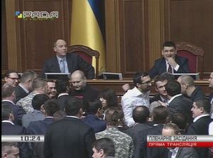 Недовольные результатом голосования депутаты блокировали трибуну Верховной Рады.