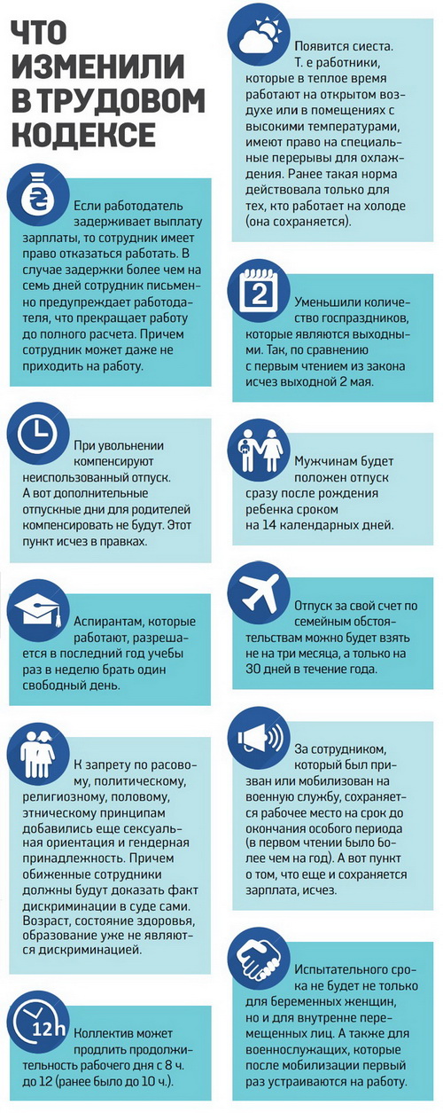 Этой осенью депутаты собираются принять Трудовой кодекс. Уже сейчас в него внесены полторы тысячи поправок. В частности, из главного закона о труде исчез выходной 2 мая, зато внесена сиеста - традиционный для жарких стран отдых среди дня. Появились льготы для военных и переселенцев, а также для молодых отцов (см. инфографику). Но профсоюзы недовольны - они считают, что кодекс нарушает права сотрудников, и готовы с этим бороться.