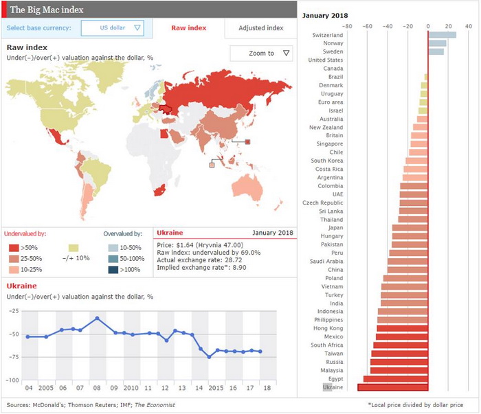Согласно "Индексу Биг-Мака"-2018 украинская гривна недооценена к доллару на 69 %.