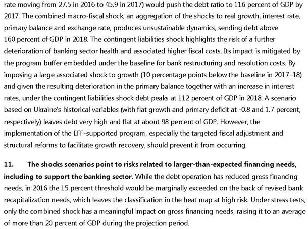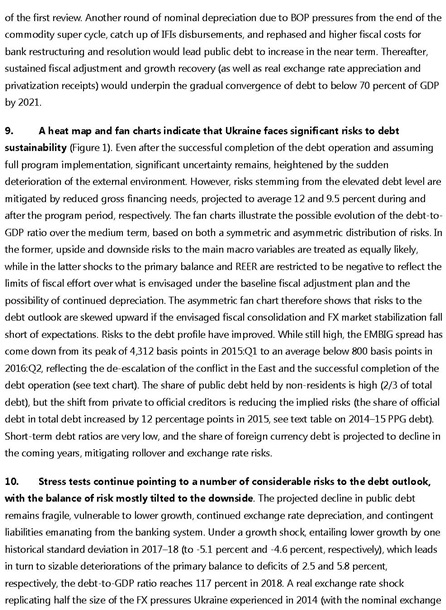 По мнению экспертов фонда, значительная неопределенность сохраняется даже после успешного завершения реструктуризации гособязательств и будет сохраняться в случае полного выполнения программы сотрудничества с МВФ, особенно в случае резкого ухудшения состояния внешней среды.